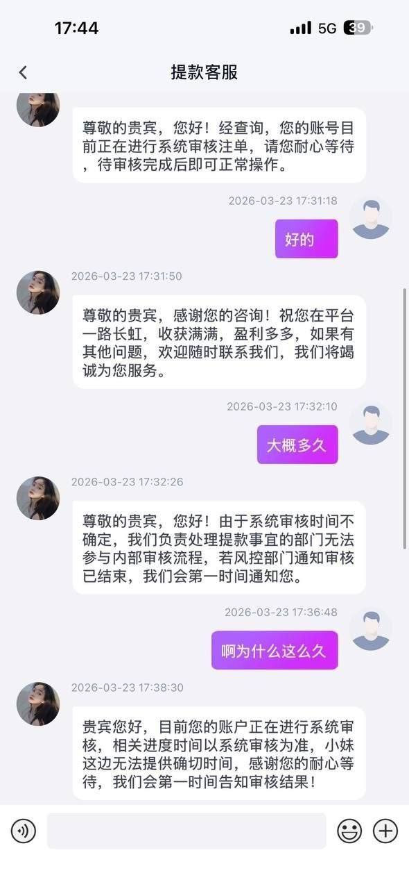 这一拖就是两天,客服只会重复“正在审核,请耐心等待”。问多了要么不回,要么甩一句“风控部门在处理,时间不确定”。现在账号已经被限制登录和操作,眼看就要被永久封号,里面的余额和流水全部卡死,一分钱都动不了。